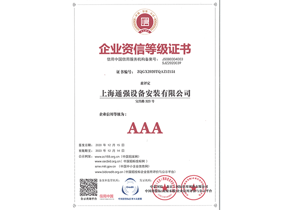 上海通強設備安裝有限公司注冊資金2000萬元,資產總量為100000萬元的專業設備安裝公司,公司專業從事工業與民用建筑的設備安裝、非標設備的制作、鋼結構制作安裝、中央空調系統的安裝,水電及管道的安裝。經過20多年艱苦創業現已成為一個具有國家二級安裝資質,獲得上海市“重合同,守信用”的施工單位。